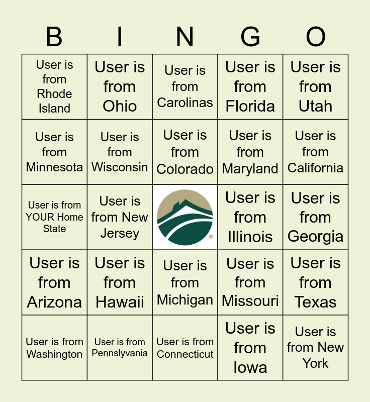 This bingo card has a free space and 24 words: User is from Hawaii, User is from Pennslyvania, User is from Colorado, User is from Washington, User is from Utah, User is from Rhode Island, User is from Minnesota, User is from Ohio, User is from Illinois, User is from Michigan, User is from Maryland, User is from YOUR Home State, User is from Missouri, User is from Texas, User is from Wisconsin, User is from Iowa, User is from Georgia, User is from Carolinas, User is from California, User is from New Jersey, User is from New York, User is from Arizona, User is from Florida and User is from Connecticut.