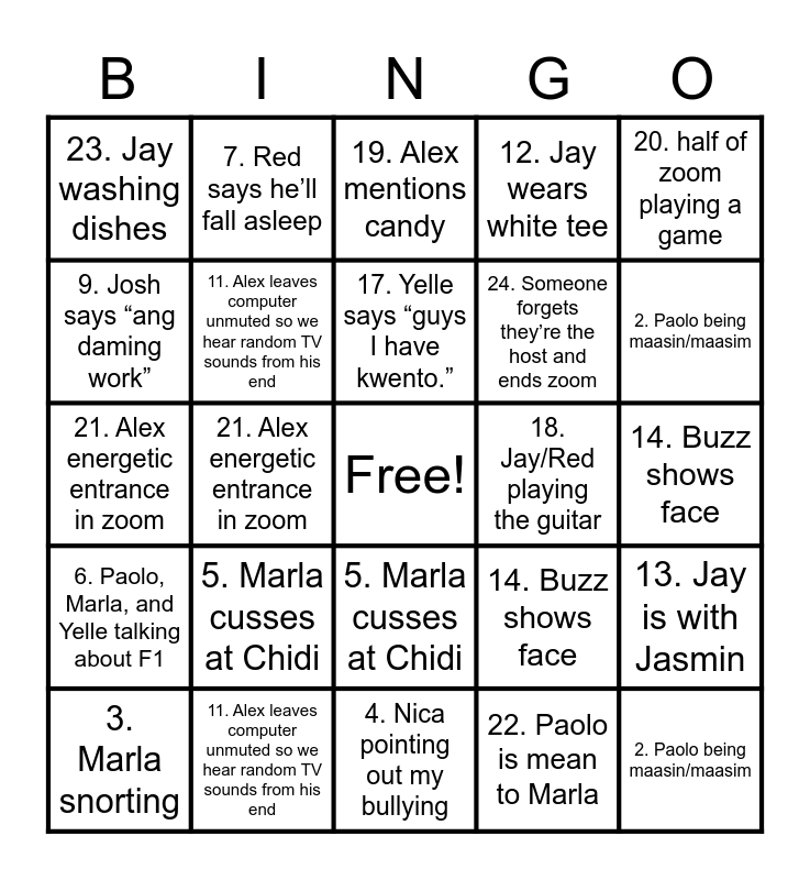 This bingo card has a free space and 48 words: 1. Me, red, Josh not wearing a shirt, 2. Paolo being maasin/maasim, 3. Marla snorting, 4. Nica pointing out my bullying, 5. Marla cusses at Chidi, 6. Paolo, Marla, and Yelle talking about F1, 7. Red says he’ll fall asleep, 8. Red actually falls asleep, 9. Josh says “ang daming work”, 10. Josh says he’s not gonna drink tonight... then drinks, 11. Alex leaves computer unmuted so we hear random TV sounds from his end, 12. Jay wears white tee, 13. Jay is with Jasmin, 14. Buzz shows face, 15. Yelle smokes, 16. Movies or food, 17. Yelle says “guys I have kwento.”, 18. Jay/Red playing the guitar, 19. Alex mentions candy, 20. half of zoom playing a game, 21. Alex energetic entrance in zoom, 22. Paolo is mean to Marla, 23. Jay washing dishes, 24. Someone forgets they’re the host and ends zoom, 1. Me, red, Josh not wearing a shirt, 2. Paolo being maasin/maasim, 3. Marla snorting, 4. Nica pointing out my bullying, 5. Marla cusses at Chidi, 6. Paolo, Marla, and Yelle talking about F1, 7. Red says he’ll fall asleep, 8. Red actually falls asleep, 9. Josh says “ang daming work”, 10. Josh says he’s not gonna drink tonight... then drinks, 11. Alex leaves computer unmuted so we hear random TV sounds from his end, 12. Jay wears white tee, 13. Jay is with Jasmin, 14. Buzz shows face, 15. Yelle smokes, 16. Movies or food, 17. Yelle says “guys I have kwento.”, 18. Jay/Red playing the guitar, 19. Alex mentions candy, 20. half of zoom playing a game, 21. Alex energetic entrance in zoom, 22. Paolo is mean to Marla, 23. Jay washing dishes and 24. Someone forgets they’re the host and ends zoom.