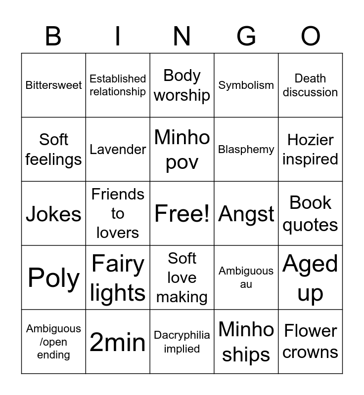 This bingo card has a free space and 24 words: Fairy lights, 2min, Minho pov, Ambiguous /open ending, Death discussion, Bittersweet, Soft feelings, Established relationship, Angst, Soft love making, Blasphemy, Jokes, Ambiguous au, Aged up, Lavender, Minho ships, Book quotes, Body worship, Hozier inspired, Friends to lovers, Flower crowns, Poly, Symbolism and Dacryphilia implied.
