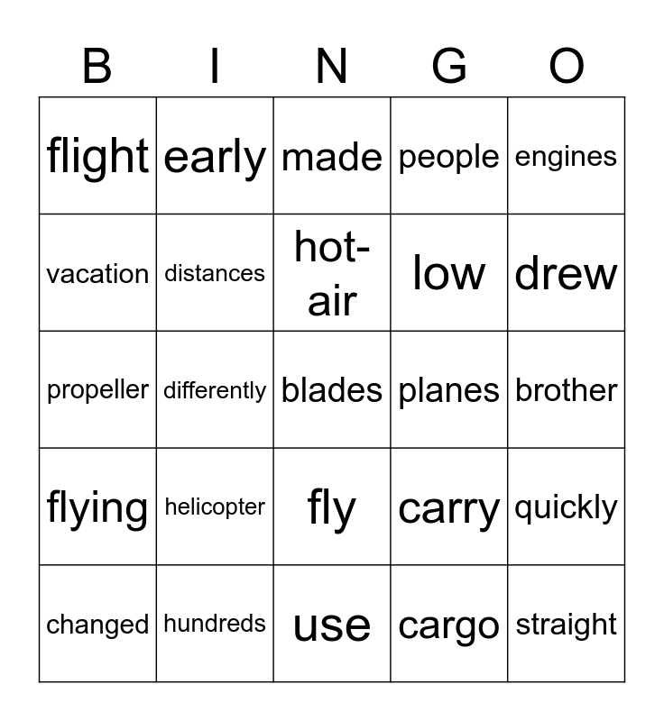 This bingo card has a free space and 24 words: helicopter, hundreds, hot-air, changed, engines, flight, vacation, early, planes, fly, low, propeller, carry, quickly, distances, cargo, brother, made, drew, differently, straight, flying, people and use.