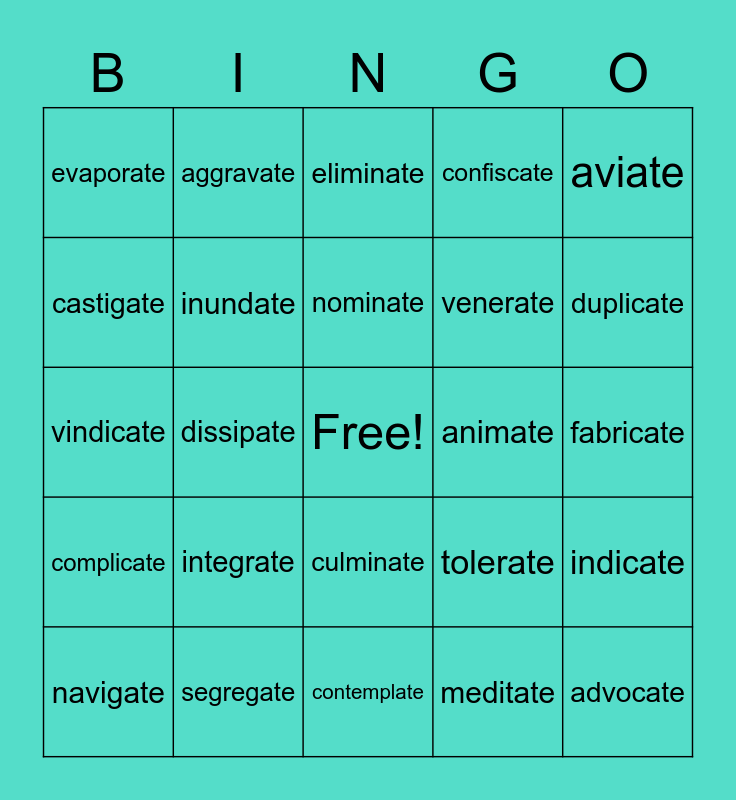 This bingo card has a free space and 24 words: integrate, segregate, nominate, navigate, aviate, evaporate, castigate, aggravate, animate, culminate, venerate, vindicate, tolerate, indicate, inundate, meditate, fabricate, eliminate, duplicate, dissipate, advocate, complicate, confiscate and contemplate.