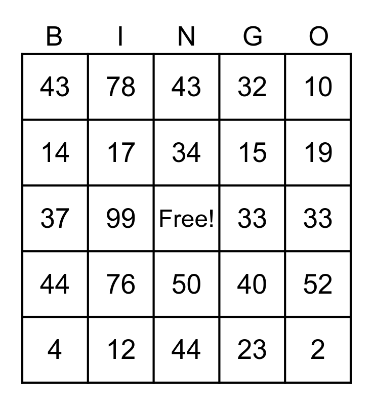 This bingo card has a free space and 44 words: 1, 2, 3, 4, 5, 23, 43, 22, 10, 12, 32, 33, 50, 76, 45, 44, 34, 37, 23, 19, 78, 56, 66, 43, 34, 33, 65, 62, 40, 44, 98, 52, 34, 11, 99, 54, 67, 45, 34, 14, 15, 16, 17 and 18.