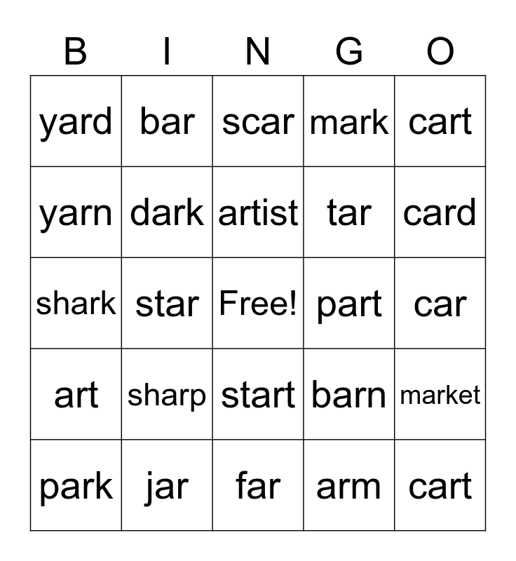 This bingo card has a free space and 29 words: park, bark, star, hard, yard, scar, dark, sharp, part, jar, car, cart, far, arm, card, farm, start, art, cart, shark, barn, marsh, tar, yarn, mark, bar, market, artist and charm.