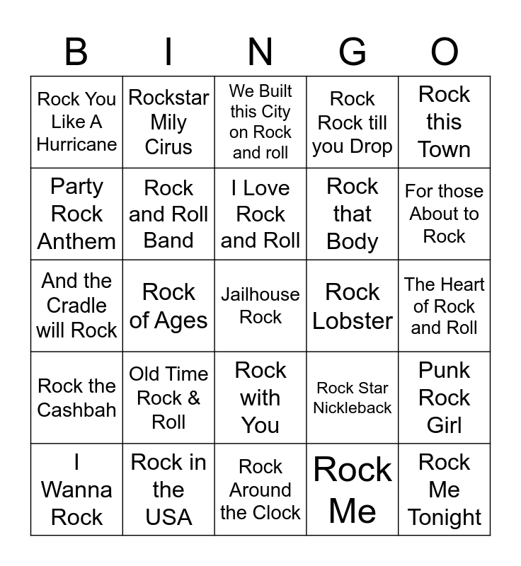 This bingo card has a free space and 39 words: We Will Rock You, Rock and Roll Suicide, Crocodile Rock, Rock and Roll Band, I Wanna Rock, Rock with You, I Love Rock and Roll, Rock Me Amadeus, Rock this Town, Rock the Cashbah, Rock of Ages, Rock Rock till you Drop, Rock Me Tonight, The Heart of Rock and Roll, Rock Lobster, Old Time Rock & Roll, Long Live Rock, Rock You Like A Hurricane, Detroit Rock City, Rock Star Nickleback, Party Rock Anthem, Rock Around the Clock, Rock that Body, For those About to Rock, Rock Me to the Top, Rocket Queen, Rocket Man, Rockin the Free World, Rockstar Post Malone, Rockstar Mily Cirus, Rock and Roll, A Little Country and A Little Bit Rock, We Built this City on Rock and roll, Rock in the USA, Rock Me, Cherub Rock, Punk Rock Girl, And the Cradle will Rock and Love On the Rocks.