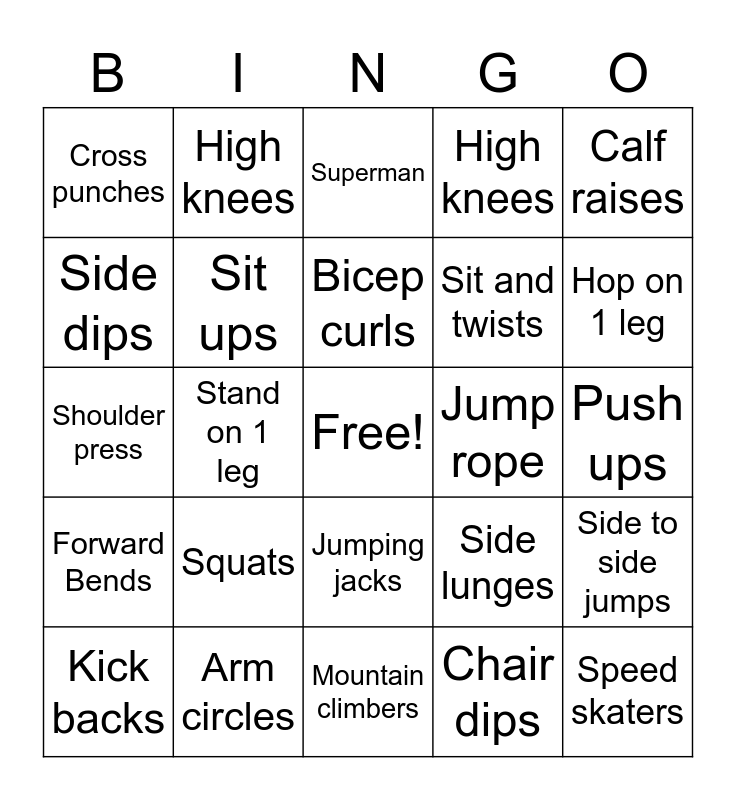 This bingo card has a free space and 24 words: Squats, Arm circles, Bicep curls, Kick backs, Calf raises, Cross punches, Side dips, High knees, Jump rope, Jumping jacks, Sit and twists, Shoulder press, Side lunges, Side to side jumps, Sit ups, Chair dips, Push ups, Superman, Hop on 1 leg, Stand on 1 leg, Speed skaters, Forward Bends, High knees and Mountain climbers.