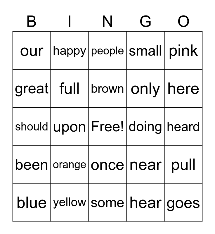 This bingo card has a free space and 24 words: orange, yellow, brown, blue, pink, our, great, happy, doing, once, only, should, near, pull, full, hear, heard, people, here, upon, goes, been, small and some.