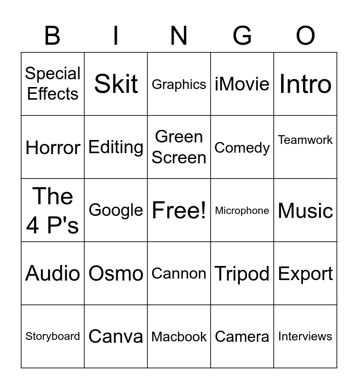 This bingo card has a free space and 34 words: Tech Tip, Camera, Feedback, Lighting, Audio, Editing, Intro, Storyboard, Skit, Parody, Green Screen, Graphics, Debate Skits, Halloween Special, Microphone, Teamwork, Canva, The 4 P's, Osmo, Tripod, Cannon, You Belong Here!, Special Effects, Music, Macbook, Interviews, iMovie, Plot, Comedy, Horror, Drama, Google, Export and Download.