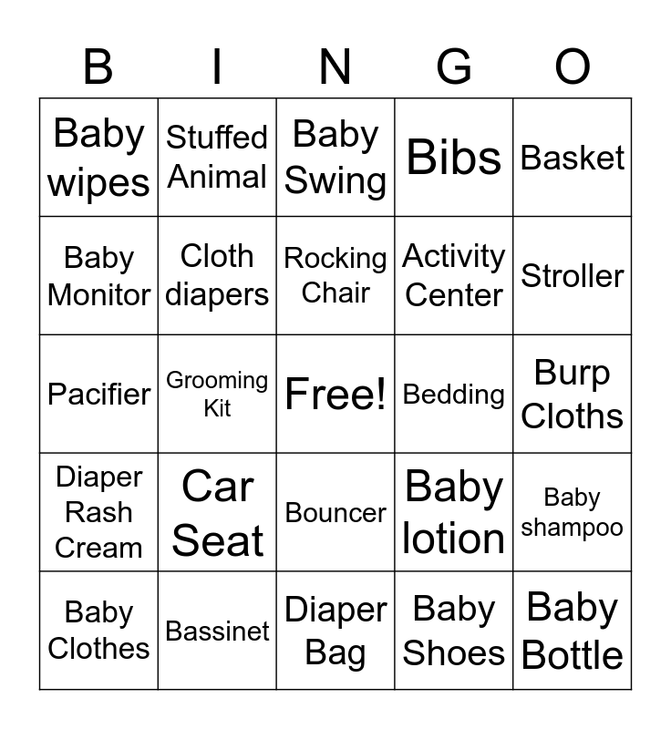 This bingo card has a free space and 44 words: Baby Bath, Baby Bottle, Baby Carrier, Baby Clothes, Baby Food, Baby Shoes, Baby Swing, Baby Walker, Basket, Bassinet, Bibs, Bedding, Bouncer, Car Seat, Diapers, Diaper Bag, High Chair, Pacifier, Rattle, Stroller, Stuffed Animal, Teething Rings, Blanket, Baby wipes, Onsies, Burp Cloths, Bottle Brush, Baby wash, Baby lotion, Diaper Rash Cream, Baby Powder, Baby shampoo, Hooded Towel, Mobile, Grooming Kit, Sippy Cups, Baby Spoons, Pack n' Play, Rocking Chair, Baby Monitor, Activity Center, Wipe Warmer, Cloth diapers and Baby Hat.