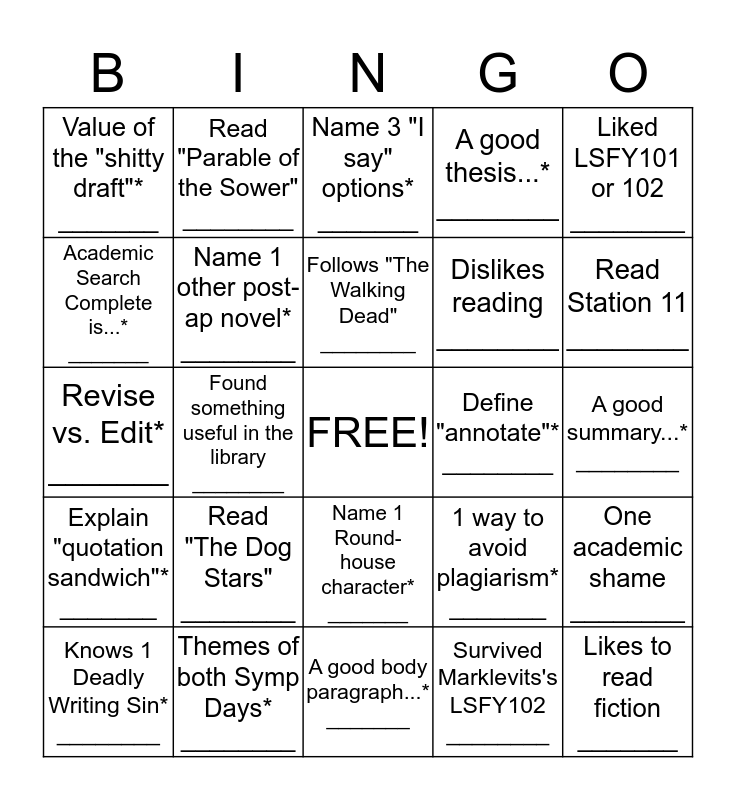 This bingo card has a free space and 24 words: Read "The Dog Stars" ________, Themes of both Symp Days* ________, Follows "The Walking Dead" ________, Knows 1 Deadly Writing Sin* ________, Liked LSFY101 or 102 ________, Value of the "shitty draft"* _______, Academic Search Complete is...* _______, Read "Parable of the Sower" ________, Define "annotate"* ________, Name 1 Round-house character* _______, Dislikes reading ________, Revise vs. Edit* _______, 1 way to avoid plagiarism* _______, One academic shame ________, Name 1 other post-ap novel* ________, Survived Marklevits's LSFY102 ________, A good summary...* ________, Name 3 "I say" options* _______, Read Station 11 ________, Found something useful in the library ________, Likes to read fiction _______, Explain "quotation sandwich"* _______, A good thesis...* ________ and A good body paragraph...* _______.