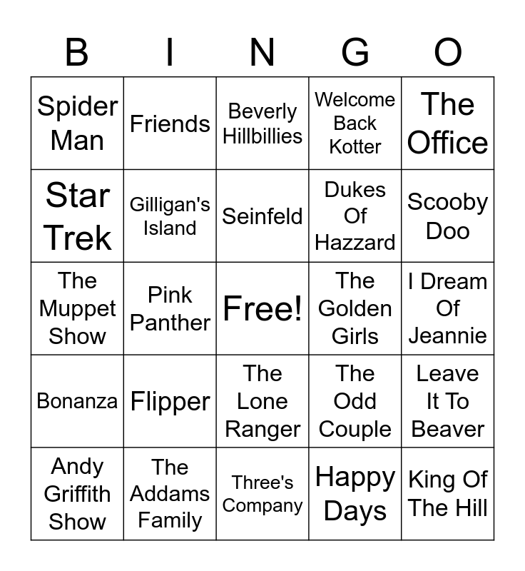 This bingo card has a free space and 60 words: The A- Team, The Addams Family, Batman, Bonanza, Happy Days, Cheers, Gilligan's Island, Love Boat, Dukes Of Hazzard, Laverne & Shirley, Welcome Back Kotter, Mary Tyler Moore Show, Star Trek, Law & Order, Big Bang Theory, Spider Man, King Of The Hill, The Office, The Fresh Prince Of Bel Air, Seinfeld, The Golden Girls, Beverly Hillbillies, Andy Griffith Show, Leave It To Beaver, The Jeffersons, Sanford & Son, The Flintstones, The Jetsons, Scooby Doo, Popeye, Inspector Gadget, Cops, Roseanne, Frasier, Friends, Spongebob Squarepants, Looney Tunes, Pink Panther, Family Guy, The Muppet Show, Mr. Ed, Flipper, I Dream Of Jeannie, Different Strokes, The Odd Couple, The Brady Bunch, Hawaii 5-0, George Of The Jungle, Magnum PI, The Lone Ranger, Three's Company, Green Acres, Fraggle Rock, Seasame Street, MASH, WKRP In Cincinnati, Hong Kong Phooey, Little House On THe Prairie, Superman and The Six Million Dollar Man.