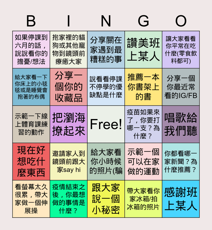 This bingo card has a free space and 24 words: 邀請家人到鏡頭前跟大家say hi, 疫情結束之後,你最想做的事情是什麼?, 說看看停課不停學的優缺點是什麼, 看螢幕太久很累,帶大家做一個伸展操, 讓大家看看你平常在吃什麼(零食飲料都可), 如果停課到六月的話,說說看你的擔憂/想法, 給大家看一下你床上的小毯毯或是睡覺會抱著的布偶, 抱家裡的貓狗或其他寵物到鏡頭前療癒大家, 疫苗如果來了,你要打哪一支?為什麼?, 給大家看你小時候的照片(騙, 推薦一本你書架上的書, 示範一下線上體育課練習的動作, 示範一個可以在家做的運動, 你都看哪一家新聞?為什麼推薦?, 分享一個你的收藏品, 帶大家看你家冰箱/拍冰箱的照片, 唱歌給我們聽, 分享關在家遇到最糟糕的事, 分享一個你最近常看的IG/FB, 把瀏海撩起來, 感謝班上某人, 現在好想吃什麼東西, 讚美班上某人 and 跟大家說一個小秘密.