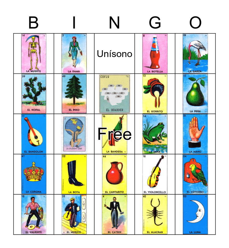 This bingo card has 63 images, a free space and 8 words: Fall, Laguh, Loud, Unísono, Boy, Scard, Ganger and Hola.