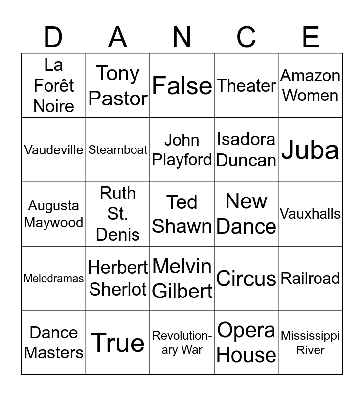 This bingo card has 25 words: Herbert Sherlot, Revolution-ary War, John Playford, Dance Masters, Amazon Women, La Forêt Noire, Vaudeville, Tony Pastor, New Dance, Melvin Gilbert, Isadora Duncan, Augusta Maywood, Circus, Railroad, Steamboat, Mississippi River, Vauxhalls, False, Juba, Ruth St. Denis, Ted Shawn, True, Melodramas, Theater and Opera House.