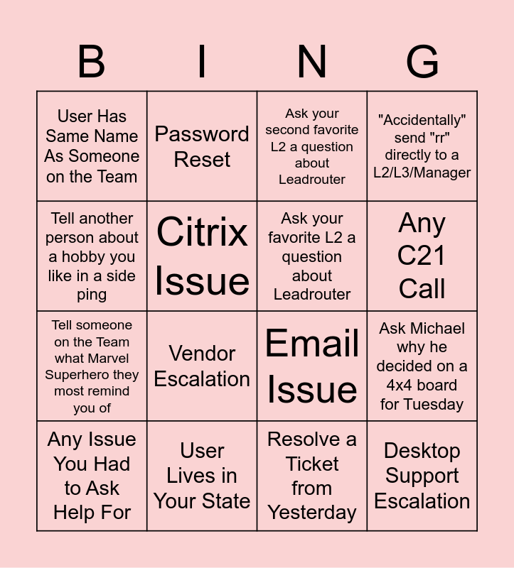 This bingo card has 16 words: User Lives in Your State, Ask Michael why he decided on a 4x4 board for Tuesday, Ask your second favorite L2 a question about Leadrouter, User Has Same Name As Someone on the Team, Tell someone on the Team what Marvel Superhero they most remind you of, Password Reset, Email Issue, Resolve a Ticket from Yesterday, Tell another person about a hobby you like in a side ping, Citrix Issue, Any Issue You Had to Ask Help For, "Accidentally" send "rr" directly to a L2/L3/Manager, Vendor Escalation, Any C21 Call, Ask your favorite L2 a question about Leadrouter and Desktop Support Escalation.