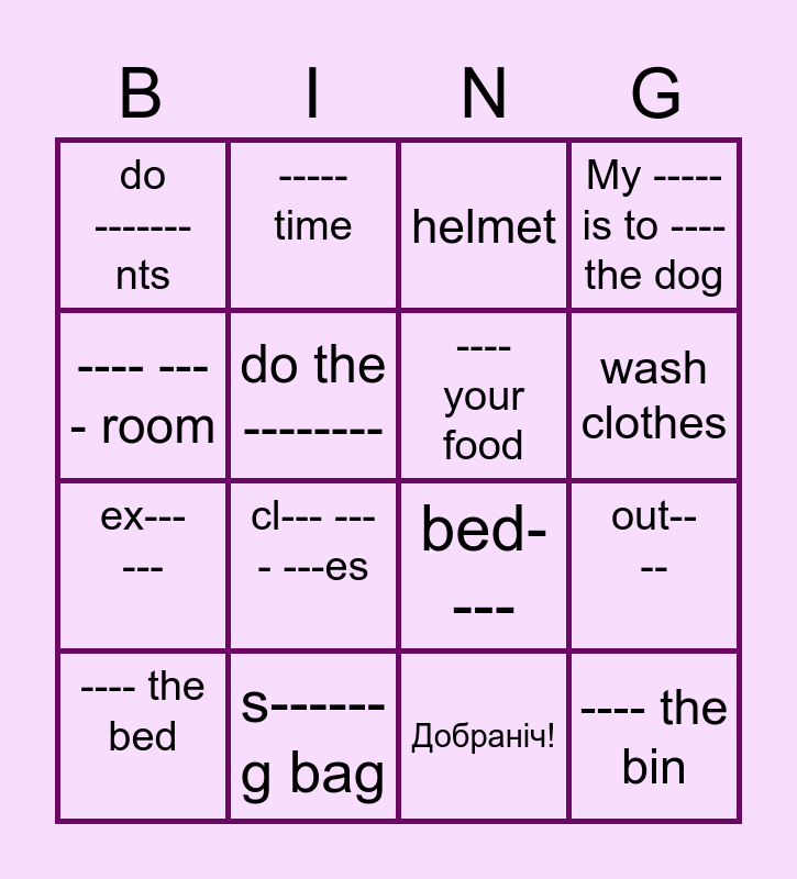 This bingo card has 16 words: s------g bag, out----, helmet, do ------- nts, ex------, -----time, bed----, Добраніч!, ---- ---- room, do the --------, ---- the bed, My ----- is to ---- the dog, cl--- ---- ---es, wash clothes, ---- your food and ---- the bin.
