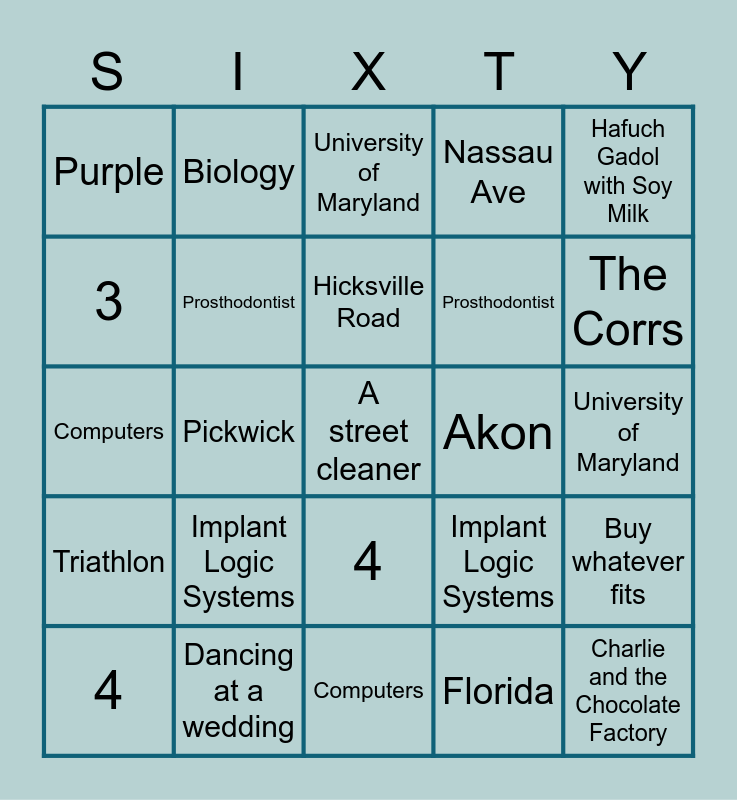 This bingo card has 73 words: Free!, Pickwick, Purple, Scooter, Sat Night, A street cleaner, Triathlon, Florida, Implant Logic Systems, Bubba Breindel, Charlie and the Chocolate Factory, Mama Mia, Prosthodontist, University of Maryland, Psychology, Biology, Computers, 3, 36, Akon, Hicksville Road, Nassau Ave, Hafuch Gadol with Soy Milk, Microwaved Oat Milk, 4, 2, Tamir, Green 2-piece dress, Clarinet, 16, Dancing at a wedding, A box, 7, Bob Dole, Pickwick, Purple, Scooter, Sat Night, A street cleaner, Triathlon, Florida, Implant Logic Systems, Bubba Breindel, Charlie and the Chocolate Factory, Mama Mia, Prosthodontist, University of Maryland, Psychology, Biology, Computers, 3, 36, Akon, Hicksville Road, Nassau Ave, Hafuch Gadol with Soy Milk, Microwaved Oat Milk, 4, 2, Tamir, Green 2-piece dress, Clarinet, 16, The Corrs, Dancing at a wedding, A box, 7, Bob Dole, Buy whatever fits, Don’t be Lazy, Pancake, Brown and 2006.