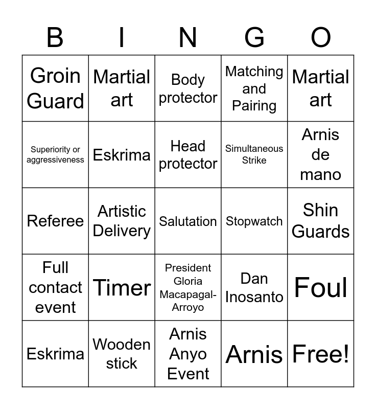 This bingo card has 34 words: Free!, Arnis, Kali, Padded stick, Full contact event, Eskrima, Martial art, Eskrima, Martial art, Bothoan, Head protector, Body protector, Flags, Scoreboard, Stopwatch, Arnis de mano, Wooden stick, Referee, Timer, Dan Inosanto, President Gloria Macapagal- Arroyo, Espada Y Daga, Groin Guard, Shin Guards, Arnis Anyo Event, Salutation, Matching and Pairing, Spontaneous strike, Simultaneous Strike, Superiority or aggressiveness, Major fatal technique, Artistic Delivery, Foul and Disarming.