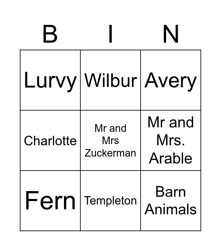 This bingo card has a free space and 9 words: Fern, Wilbur, Mr and Mrs. Arable, Lurvy, Avery, Charlotte, Templeton, Barn Animals and Mr and Mrs Zuckerman.