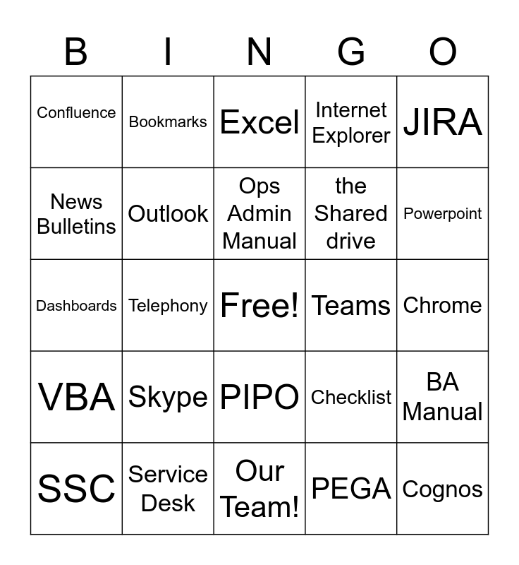 This bingo card has a free space and 29 words: SSC, Sharepoint, Telephony, Genesys, Confluence, Excel, Outlook, Skype, Teams, Service Desk, Chrome, Cognos, Our Team!, PEGA, Powerpoint, Bridge, PIPO, VBA, JIRA, Dashboards, Checklist, Huddles, the Shared drive, News Bulletins, Internet Explorer, Bookmarks, BA Manual, Ops Admin Manual and Infosource.
