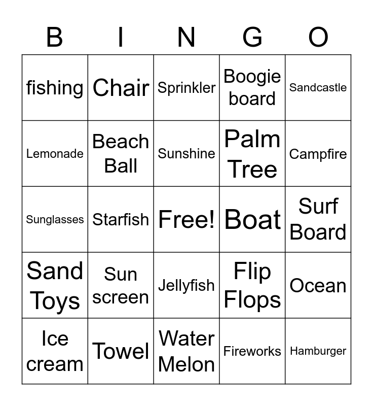 This bingo card has a free space and 24 words: Sun screen, Towel, Sunshine, Ice cream, Sandcastle, fishing, Lemonade, Chair, Boat, Jellyfish, Palm Tree, Sunglasses, Flip Flops, Ocean, Beach Ball, Fireworks, Surf Board, Sprinkler, Campfire, Starfish, Hamburger, Sand Toys, Boogie board and Water Melon.