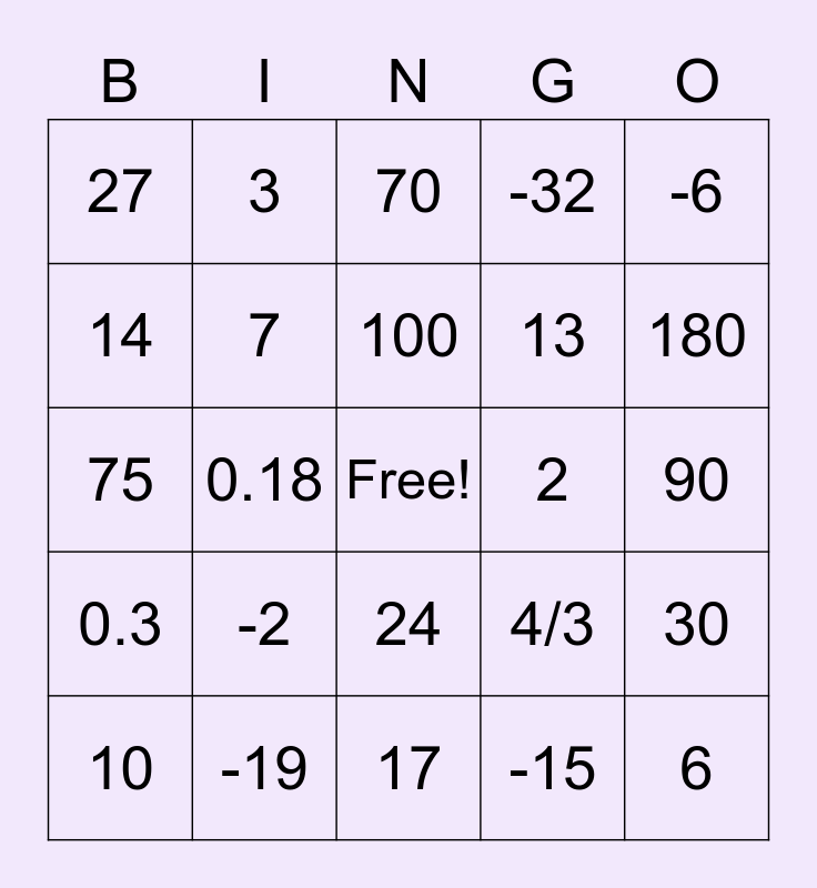 This bingo card has a free space and 34 words: 0.5, -15, 1/5, 1/4, 0.3, 7, -6, 10, 3, 0.2, 100, 70, 1/12, 32, 2, 180, -19, 75, -2, 4/3, 24, 5, 27, 90, 17, 6, -32, 1/20, 13, 14, 0.125, 0.18, 30 and 19.