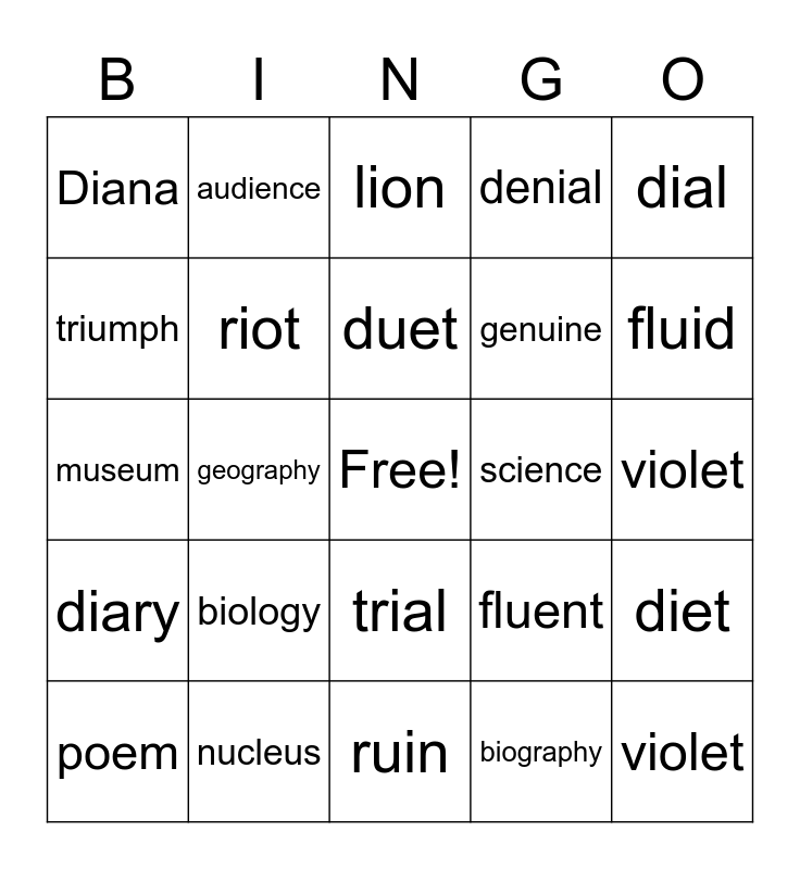 This bingo card has a free space and 24 words: biology, nucleus, duet, poem, dial, Diana, triumph, audience, science, trial, genuine, museum, fluent, diet, riot, biography, violet, lion, fluid, geography, violet, diary, denial and ruin.
