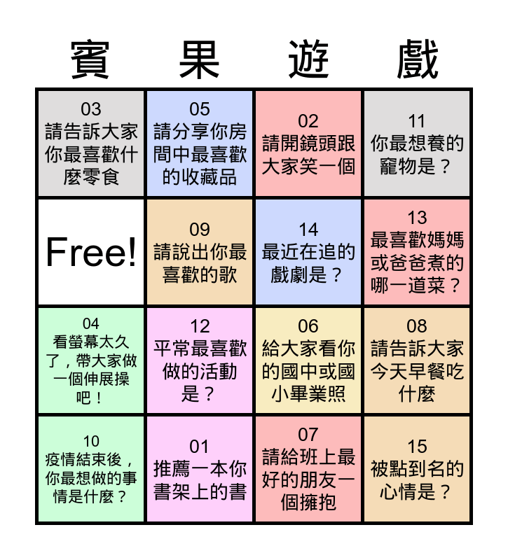 This bingo card has 16 words: 01 推薦一本你書架上的書, 08 請告訴大家今天早餐吃什麼, 02 請開鏡頭跟大家笑一個, 03 請告訴大家你最喜歡什麼零食, 04 看螢幕太久了,帶大家做一個伸展操吧!, 05 請分享你房間中最喜歡的收藏品, 06 給大家看你的國中或國小畢業照, 07 請給班上最好的朋友一個擁抱, Free!, 09 請說出你最喜歡的歌, 10 疫情結束後,你最想做的事情是什麼?, 11 你最想養的竉物是?, 12 平常最喜歡做的活動是?, 13 最喜歡媽媽或爸爸煮的哪一道菜?, 14 最近在追的戲劇是? and 15 被點到名的心情是?.