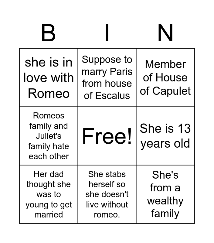 This bingo card has a free space and 8 words: She is 13 years old, Member of House of Capulet, Suppose to marry Paris from house of Escalus, Her dad thought she was to young to get married, she is in love with Romeo, She's from a wealthy family, Romeos family and Juliet's family hate each other and She stabs herself so she doesn't live without romeo..