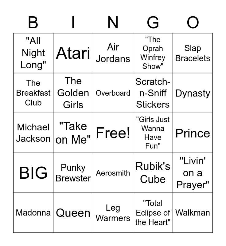 This bingo card has a free space and 25 words: Punky Brewster, Leg Warmers, Overboard, Madonna, Slap Bracelets, "All Night Long", The Breakfast Club, Atari, "Girls Just Wanna Have Fun", Aerosmith, Scratch-n-Sniff Stickers, Michael Jackson, Rubik's Cube, "Livin' on a Prayer", The Golden Girls, Mullet Haircut, Prince, Air Jordans, Dynasty, "Take on Me", Walkman, Queen, BIG, "The Oprah Winfrey Show" and "Total Eclipse of the Heart".
