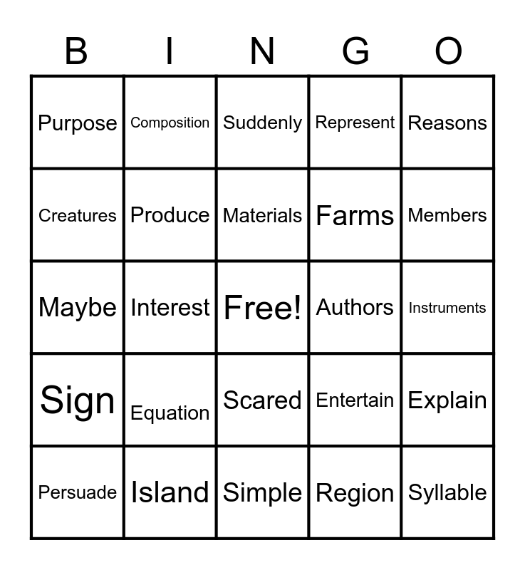 This bingo card has a free space and 24 words: Equation, Island, Materials, Persuade, Reasons, Purpose, Creatures, Composition, Authors, Scared, Farms, Maybe, Entertain, Explain, Produce, Region, Instruments, Suddenly, Members, Interest, Syllable, Sign, Represent and Simple.