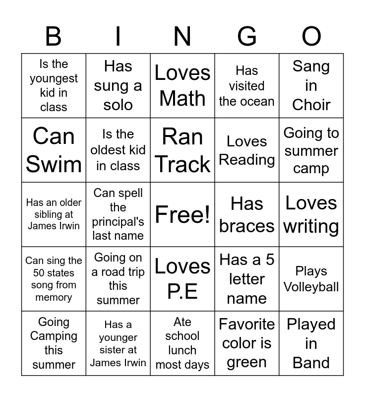 This bingo card has a free space and 29 words: Going Camping this summer, Loves Science, Can spell the principal's last name, Has a summer birthday, Is the youngest kid in class, Loves Math, Is the oldest kid in class, Going on a road trip this summer, Has braces, Has a younger sister at James Irwin, Loves writing, Played in Band, Ate school lunch most days, Favorite color is green, Going to summer camp, Can name 10 classmates with eyes closed, Loves P.E, Can sing the 50 states song from memory, Sang in Choir, Has an older sibling at James Irwin, Has a 5 letter name, Walks to school, Loves Reading, Can Swim, Has visited the ocean, Has sung a solo, Plays Volleyball, Ran Track and Plays Soccer.