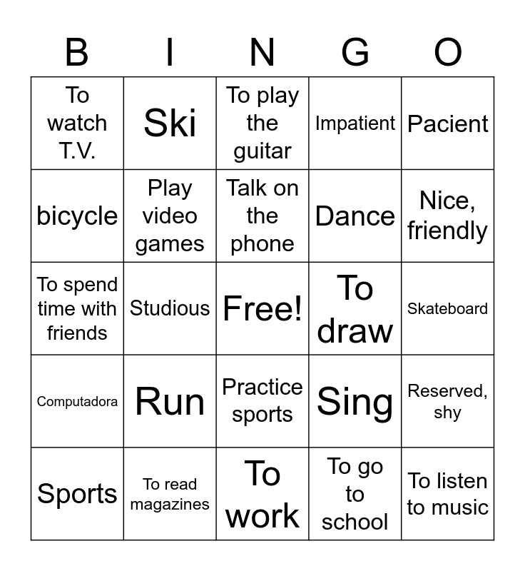 This bingo card has a free space and 24 words: Run, To read magazines, Talk on the phone, Sports, Pacient, To watch T.V., bicycle, Ski, To draw, Practice sports, Dance, To spend time with friends, Sing, Reserved, shy, Play video games, To go to school, Skateboard, To play the guitar, Nice, friendly, Studious, To listen to music, Computadora, Impatient and To work.
