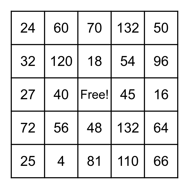 This bingo card has a free space and 29 words: 25, 9, 40, 36, 24, 70, 120, 56, 45, 4, 16, 66, 81, 110, 96, 35, 48, 72, 50, 27, 132, 77, 54, 32, 132, 60, 64, 18 and 28.