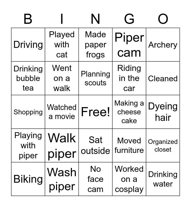 This bingo card has a free space and 24 words: Walk piper, Wash piper, Planning scouts, Biking, Archery, Driving, Drinking bubble tea, Played with cat, Making a cheese cake, Sat outside, Riding in the car, Shopping, Moved furniture, Organized closet, Went on a walk, Worked on a cosplay, Dyeing hair, Made paper frogs, Cleaned, Watched a movie, Drinking water, Playing with piper, Piper cam and No face cam.