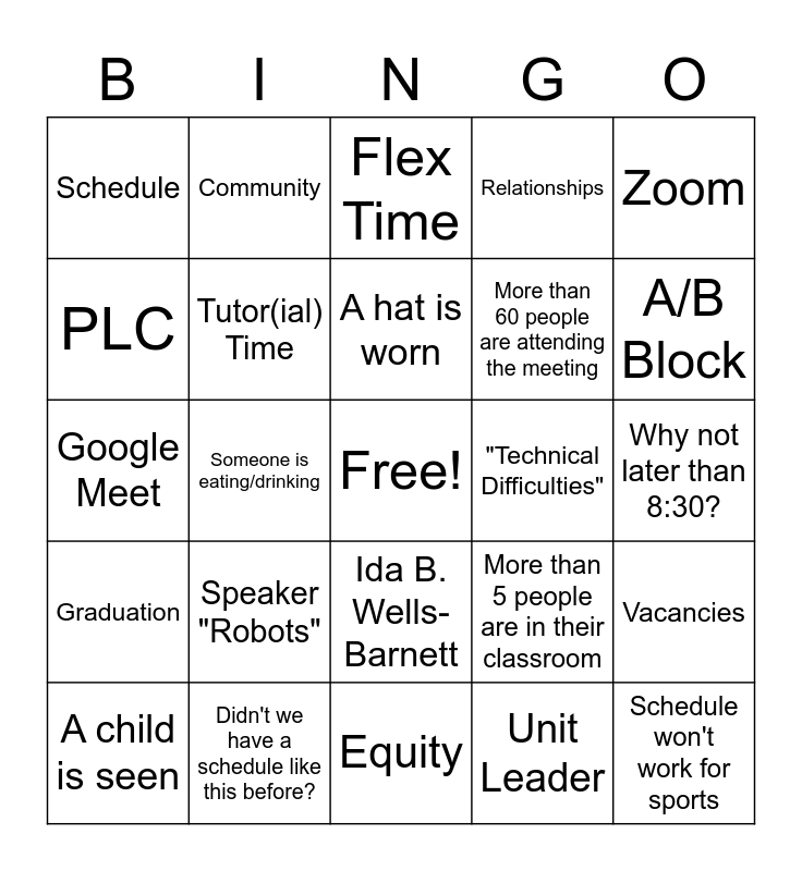 This bingo card has a free space and 29 words: A child is seen, A pet is seen, Someone is eating/drinking, Skinny 8 or All 8, Schedule, Flex Time, Tutor(ial) Time, Speaker "Robots", "Technical Difficulties", Didn't we have a schedule like this before?, Why not later than 8:30?, Schedule won't work for sports, Equity, Unit Leader, A/B Block, Substitute(s), Ida B. Wells-Barnett, Graduation, Zoom, Google Meet, More than 5 people are in their classroom, More than 10 people are in their classroom, More than 60 people are attending the meeting, PLC, Relationships, Community, Vacancies, A hat is worn and The sun is seen.