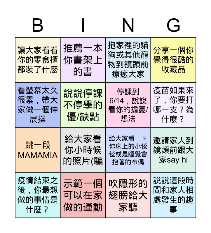 This bingo card has 16 words: 示範一個可以在家做的運動, 邀請家人到鏡頭前跟大家say hi, 抱家裡的貓狗或其他寵物到鏡頭前療癒大家, 讓大家看看你的零食櫃都裝了什麼, 跳一段MAMAMIA, 推薦一本你書架上的書, 給大家看一下你床上的小毯毯或是睡覺會抱著的布偶, 吹隱形的翅膀給大家聽, 看螢幕太久很累,帶大家做一個伸展操, 說說停課不停學的優/缺點, 疫情結束之後,你最想做的事情是什麼?, 分享一個你覺得很酷的收藏品, 給大家看你小時候的照片(騙, 疫苗如果來了,你要打哪一支?為什麼?, 停課到6/14,說說看你的擔憂/想法 and 說說這段時間和家人相處發生的趣事.