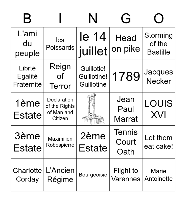 This bingo card has a free space and 24 words: Maximilien Robespierre, L'Ancien Régime, Guillotie! Guillotine! Guillotine, Charlotte Corday, Storming of the Bastille, L'ami du peuple, Librté Egalité Fraternité, les Poissards, Jean Paul Marrat, 2ème Estate, 1789, 1ème Estate, Tennis Court Oath, Let them eat cake!, Reign of Terror, Flight to Varennes, LOUIS XVI, le 14 juillet, Jacques Necker, Declaration of the Rights of Man and Citizen, Marie Antoinette, 3ème Estate, Head on pike and Bourgeoisie.