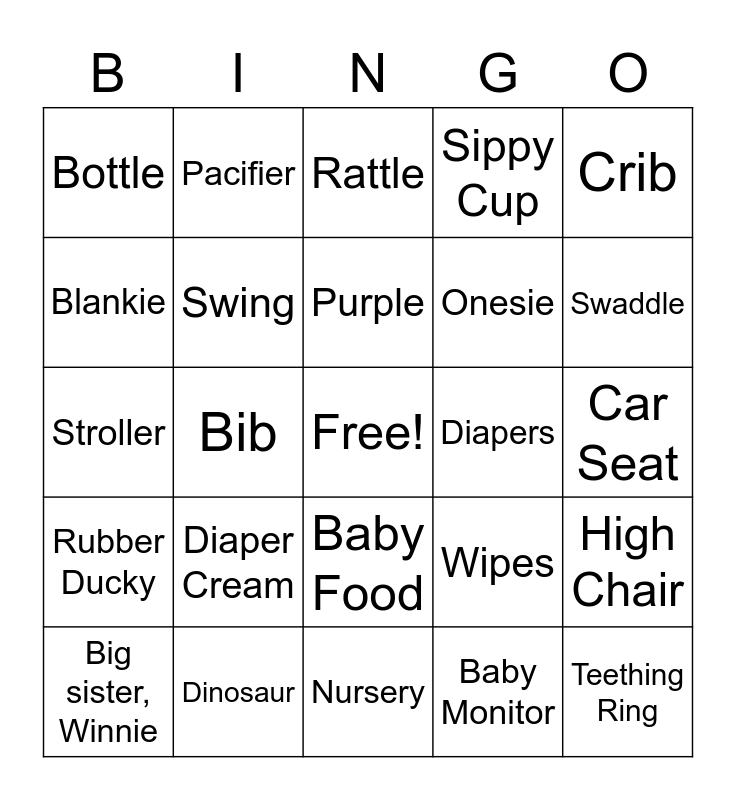 This bingo card has a free space and 24 words: Diaper Cream, Dinosaur, Purple, Big sister, Winnie, Crib, Bottle, Blankie, Pacifier, Diapers, Baby Food, Onesie, Stroller, Wipes, High Chair, Swing, Baby Monitor, Car Seat, Rattle, Swaddle, Bib, Teething Ring, Rubber Ducky, Sippy Cup and Nursery.