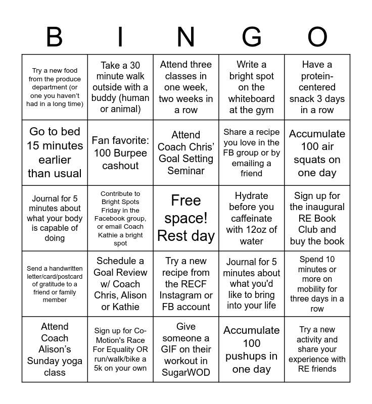 This bingo card has a free space and 24 words: Schedule a Goal Review w/ Coach Chris, Alison or Kathie, Sign up for Co-Motion's Race For Equality OR run/walk/bike a 5k on your own, Attend Coach Chris’ Goal Setting Seminar, Attend Coach Alison’s Sunday yoga class, Have a protein-centered snack 3 days in a row, Try a new food from the produce department (or one you haven’t had in a long time), Go to bed 15 minutes earlier than usual, Take a 30 minute walk outside with a buddy (human or animal), Hydrate before you caffeinate with 12oz of water, Try a new recipe from the RECF Instagram or FB account, Share a recipe you love in the FB group or by emailing a friend, Journal for 5 minutes about what your body is capable of doing, Journal for 5 minutes about what you'd like to bring into your life, Spend 10 minutes or more on mobility for three days in a row, Fan favorite: 100 Burpee cashout, Accumulate 100 pushups in one day, Sign up for the inaugural RE Book Club and buy the book, Attend three classes in one week, two weeks in a row, Accumulate 100 air squats on one day, Contribute to Bright Spots Friday in the Facebook group, or email Coach Kathie a bright spot, Try a new activity and share your experience with RE friends, Send a handwritten letter/card/postcard of gratitude to a friend or family member, Write a bright spot on the whiteboard at the gym and Give someone a GIF on their workout in SugarWOD.