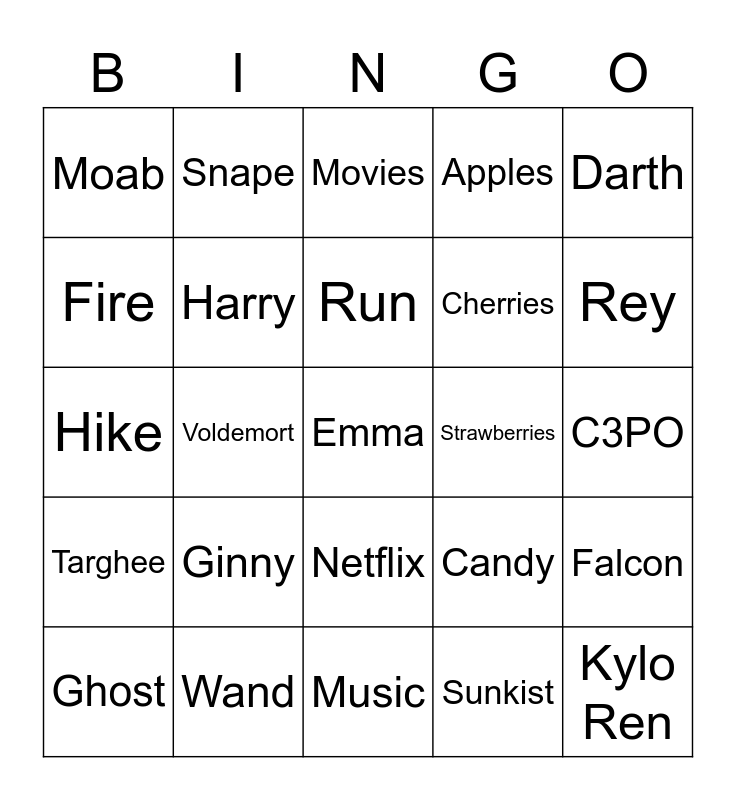 This bingo card has a free space and 59 words: Camp, Wand, Ski, Pineapple, Falcon, Tent, Harry, Bike, Strawberries, Luke, Fire, Ron, Cherries, Leia, Trailer, Snape, Run, Apples, Chewy., Hike, Voldemort, Movies, Spaghetti, C3PO, Forts, Spell, Netflix, Pizza, Darth, Bunks, Hogwarts, Cat, Ice cream, Yoda, Moab, Hagrid, Snowboard, Candy, Obi-wan, Targhee, Phoenix, Music, Sunkist, R2-D2, Smores, Hermione, iPad, Water, Rey, Ghost, Malfoy, Phone, Chocolate, Kylo Ren, Rocks, Ginny, Night bus, Watermellon and Jabba.