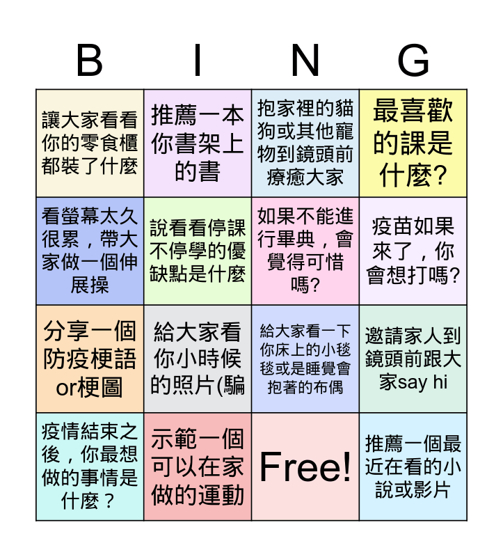 This bingo card has 16 words: 示範一個可以在家做的運動, 邀請家人到鏡頭前跟大家say hi, 抱家裡的貓狗或其他寵物到鏡頭前療癒大家, 讓大家看看你的零食櫃都裝了什麼, 分享一個防疫梗語or梗圖, 推薦一本你書架上的書, 給大家看一下你床上的小毯毯或是睡覺會抱著的布偶, Free!, 看螢幕太久很累,帶大家做一個伸展操, 說看看停課不停學的優缺點是什麼, 疫情結束之後,你最想做的事情是什麼?, 最喜歡的課是什麼?, 給大家看你小時候的照片(騙, 疫苗如果來了,你會想打嗎?, 如果不能進行畢典,會覺得可惜嗎? and 推薦一個最近在看的小說或影片.