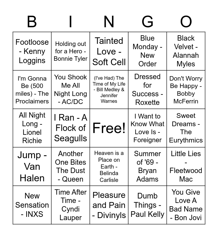 This bingo card has a free space and 34 words: Manic Monday - The Bangles, Dumb Things - Paul Kelly, 9 to 5 - Dolly Parton, If I Could Turn Back Time - Cher, Jump - Van Halen, You Shook Me All Night Long - AC/DC, Black Velvet - Alannah Myles, New Sensation - INXS, Holding out for a Hero - Bonnie Tyler, I Don't Want a Lover - Texas, (I've Had) The Time of My Life - Bill Medley & Jennifer Warnes, Tainted Love - Soft Cell, The Boys Light Up - Australian Crawl, In The Air Tonight - Phil Collins, I Want to Know What Love Is - Foreigner, Don't Worry Be Happy - Bobby McFerrin, Time After Time - Cyndi Lauper, All Night Long - Lionel Richie, Another One Bites The Dust - Queen, Summer of '69 - Bryan Adams, Heaven is a Place on Earth - Belinda Carlisle, Africa - TOTO, Footloose - Kenny Loggins, Sweet Dreams - The Eurythmics, Pleasure and Pain - Divinyls, You Give Love A Bad Name - Bon Jovi, Blue Monday - New Order, Mickey - Toni Basil, Dressed for Success - Roxette, I'm Gonna Be (500 miles) - The Proclaimers, Flashdance... What a Feeling - Irene Cara, I Ran - A Flock of Seagulls, Little Lies - Fleetwood Mac and I Wanna Dance with Somebody - Whitney Houston.