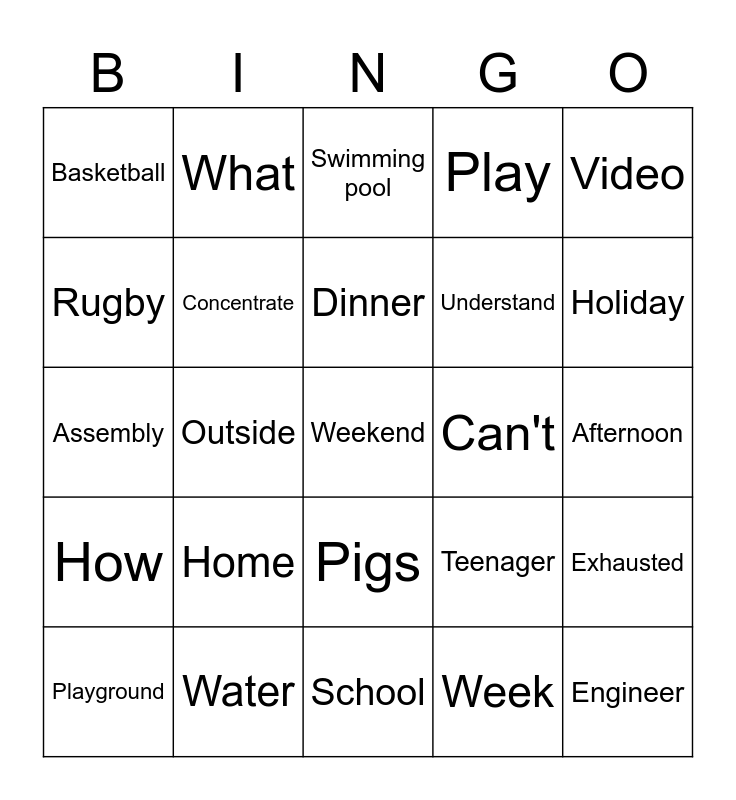 This bingo card has 25 words: Home, School, Dinner, Playground, Video, Basketball, Rugby, What, Can't, Pigs, Understand, Assembly, Teenager, Exhausted, Concentrate, Engineer, Afternoon, Swimming pool, Holiday, Outside, Weekend, Water, How, Play and Week.
