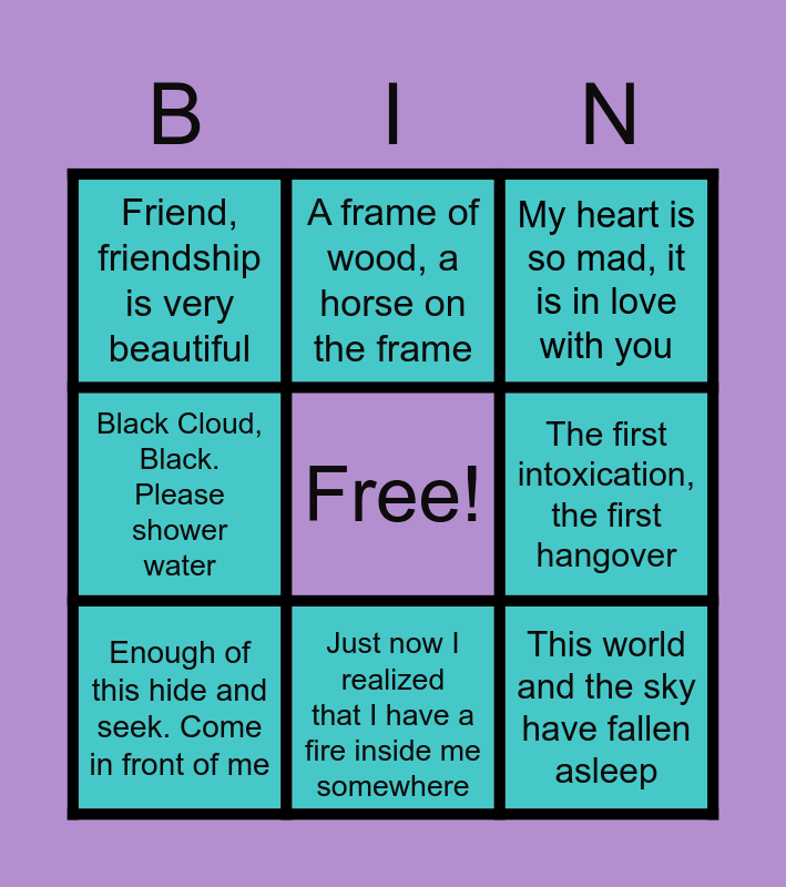 This bingo card has a free space and 8 words: The first intoxication, the first hangover, My heart is so mad, it is in love with you, A frame of wood, a horse on the frame, Enough of this hide and seek. Come in front of me, Friend, friendship is very beautiful, This world and the sky have fallen asleep, Black Cloud, Black. Please shower water and Just now I realized that I have a fire inside me somewhere.