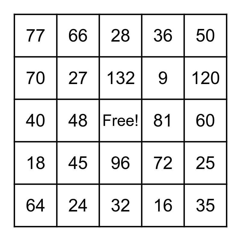 This bingo card has a free space and 28 words: 25, 4, 9, 16, 70, 28, 66, 18, 81, 64, 40, 36, 24, 32, 120, 56, 45, 27, 132, 96, 77, 54, 35, 48, 60, 72, 50 and 110.