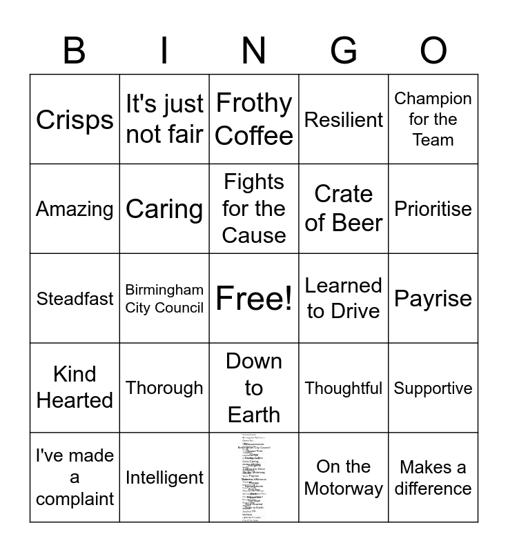 This bingo card has 1 images, a free space and 31 words: Eeeeeeeeeeee Birmingham City Council Cheese First Crisps Frothy Coffee Caring Thoughtful Learned to Drive On the Motorway Payrise Makes a difference Skeggy Spreadsheets Prioritise Warm Supportive Thorough Kind Hearted Down to Earth Ch, Eeeeeeeeeeee, Birmingham City Council, Cheese First, Crisps, Frothy Coffee, Caring, Thoughtful, Learned to Drive, On the Motorway, Payrise, Makes a difference, Skeggy, Spreadsheets, Prioritise, Warm, Supportive, Thorough, Kind Hearted, Down to Earth, Champion for the Team, Not happy with this Food, I've made a complaint, It's just not fair, Crate of Beer, Amazing, Resilient, Steadfast, Intelligent, Fights for the Cause and One of the Team.