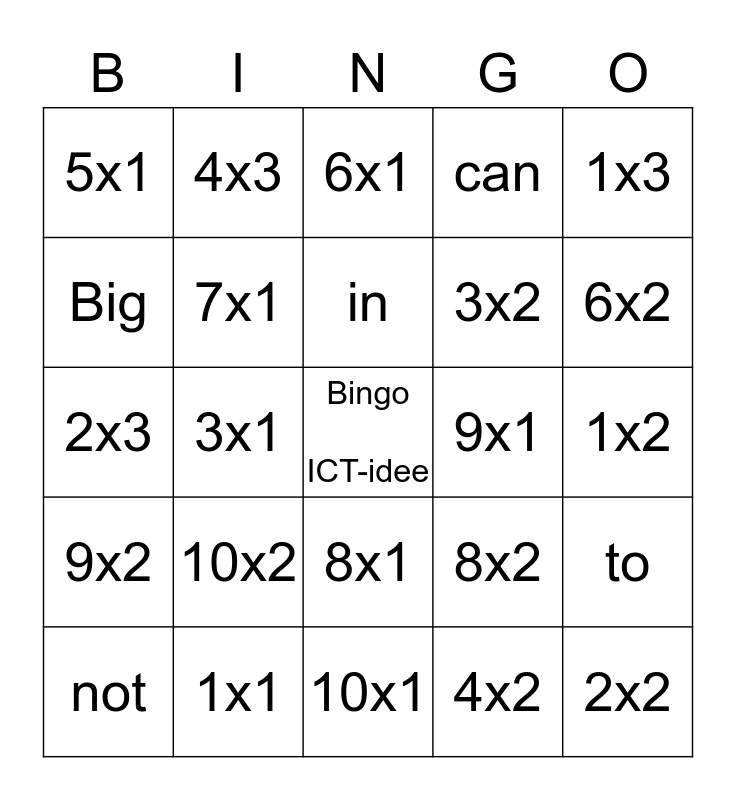 This bingo card has a free space and 30 words: 1x1, 2x1, 3x1, 4x1, 5x1, 6x1, 7x1, 8x1, 9x1, 10x1, 1x2, 2x2, 4x2, 5x2, 6x2, 7x2, 8x2, 9x2, 10x2, 1x3, 2x3, 3x3, 4x3, 3x2, Big, can, to, not, in and play.