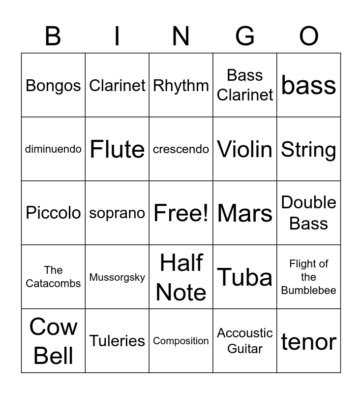 This bingo card has a free space and 76 words: Melody, Beat, Rhythm, Tempo, Presto, Andante, Largo, Dynamics, P, f, mp, mf, crescendo, diminuendo, accent, soprano, alto, tenor, baritone, bass, Woodwind, Piccolo, Flute, Clarinet, Bass Clarinet, Saxohone, Oboe, Bassoon, Brass, Trumpet, French Horn, Trombone, Baritone, Tuba, String, Violin, Viola, Cello, Double Bass, Accoustic Guitar, Electric Guitar, Electric Bass, Percussion, Snare Drum, Bass Drum, Maracas, Cow Bell, Bongos, Congas, Quarter note, Whole Note, Half Note, eighth note, sixteenth Note, Quarter Rest, Eighth Rest, Half Rest, Whole Rest, Time Signature, Measure, Mussorgsky, Beethoven, Rimsky-Korsakov, Holst, Ballet of the chicks in their shells, Mercury, Mars, Hut on Fowls legs, Fur Elise, Moonlight Sonata, Flight of the Bumblebee, The Catacombs, Tuleries, Composer, Composition and Soundscape.