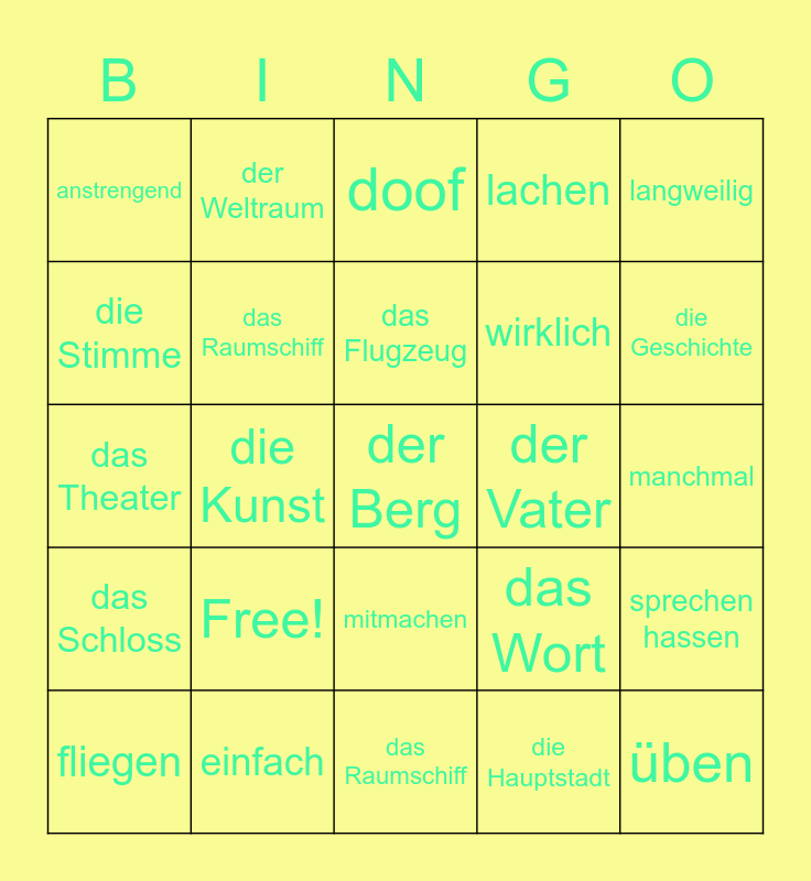 This bingo card has 25 words: Free!, das Raumschiff, das Flugzeug, fliegen, langweilig, anstrengend, die Stimme, der Weltraum, der Vater, mitmachen, wirklich, das Theater, das Wort, sprechen hassen, das Raumschiff, üben, manchmal, doof, die Geschichte, die Kunst, der Berg, einfach, das Schloss, lachen and die Hauptstadt.