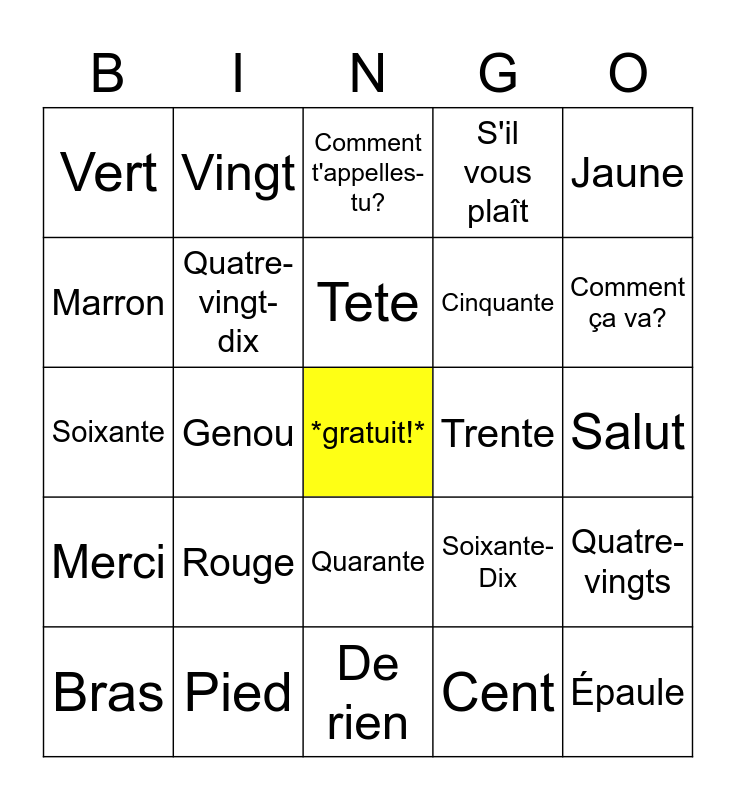 This bingo card has a free space and 24 words: Rouge, Pied, Tete, Bras, Jaune, Vert, Marron, Vingt, Trente, Quarante, Cinquante, Soixante, Soixante-Dix, Quatre-vingts, Quatre-vingt-dix, Cent, Salut, Comment t'appelles-tu?, Comment ça va?, Genou, Épaule, Merci, S'il vous plaît and De rien.